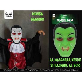 Maschera rigida in plastica con elastico. Con luce attivabile con interruttore. Pila a bottone inclusa.